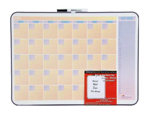 Great calendar, August 16, 2010 By Donna P (California) - See all my reviews Amazon Verified Purchase This review is from: Dooley Boards Dry Erase Calendar Board, 16 x 22 Inch (1622CALV) (Office Product) We have had a family white board calendar for a few years. Each person gets their own color and it is easy to keep track of everyone's schedule. This board has big squares for all information and the next month lined down the right side is terrific for future reminders. This board is working out great.